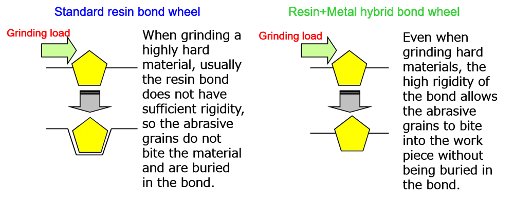 Cutting wheels are made with a composite bond of resin and metal, where metal powder and other materials are added to a resin-based bond.