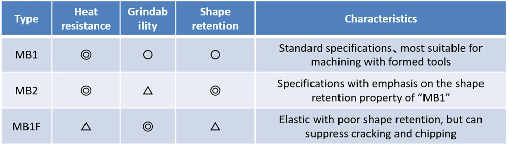 The “MB” series, a composite resin bond wheel made of resin and metal, can be used in machining with formed tools to reduce cracking and chipping. The MB series wheels also have higher shape retention than conventional resin bond wheels, higher grinding durability than metal bond wheels, and a longer service life than electrodeposited wheels of the same machining quality.